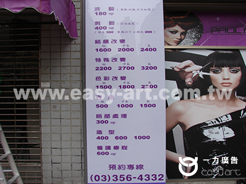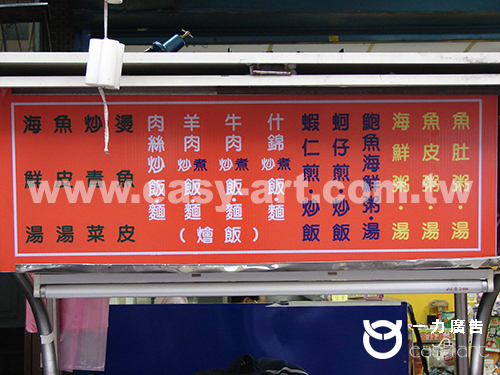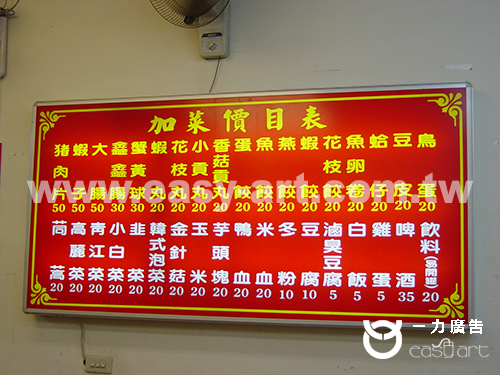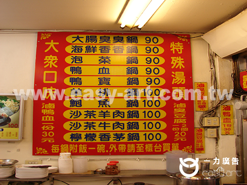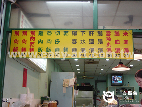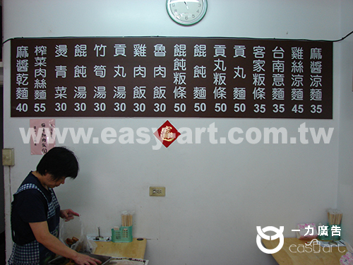 電腦割字所製作的價目表,其優點可以依時價、物價之波動調整內容或更改或增加品項售價,無須重新製作,大多是餐飲店、小吃攤販廣泛使用。